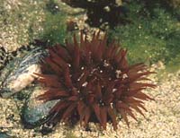 Maximum length: 5 cm Appearance: Bright red body with red tentacles. The base is attached to a rocky bottom. The tentacles may contract into the centre to hide and protect them. Depth: Middle to lower shore. Feeding: The beadlet is a secondary consumer. It is carnivorous, feeding on small invertebrates. The tentacles have stinging cells that attach to its prey. You can feel the stinging cells if you gently touch the tentacles with a finger, they feel sticky as the stinging cells attach to your skin. Don't worry, it doesn't hurt! Environment: The beadlet anemone lives in rock pools on the shore and in the shallower part of the sea below low tide level. Other facts: Beadlets are thought to reproduce asexually forming a colony. The members of a colony attack intruders. Classification: Beadlets are members of the animal kingdom. They are related to jellyfish. |