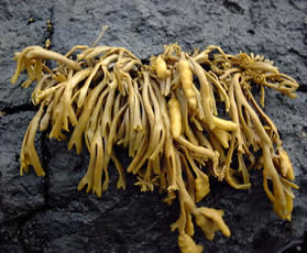 Maximum length: 15 cm. Appearance: Dark greenish brown, in dense tufts. The fronds have no midrib or bladders. The edges are curled inwards. Depth: Upper shore. Feeding: Channelled wrack is a producer. It makes its own food by photosynthesis. It has chlorophyll just like most land plants. Its colour is due to extra pigments which allow it to absorb light efficiently while under water. Environment: Channelled wrack grows on rocks high up on the shore often above the high water level on neap tides. Other facts: These algae must survive out of water for many hours. The fronds curl to reduces water loss. They take in water rapidly when the tide returns. Classification: Channelled wrack is a member of the protoctista group, the brown algae. |