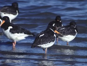 Maximum length: 40-45cm. Appearance: Long, orange bill, pink legs, black and white plumage. Has a penetrating, shrill call. Feeding: Oystercatchers are carnivores, they use their bills to probe in sand and mud to find small invertebrates. Environment: Oystercatchers are common around most seashores but may travel some way inland along estuaries. Other facts: Apart from the narrow, probing bill, oystercatchers have long legs with webbed feet for walking around on soft mud in estuaries. Classification: Oystercatchers are a member of the vertebrate group birds. |