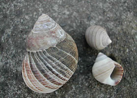 Maximum length: 3 cm. Appearance: Brown or grey spired shell. The outer lip of the opening meets the spire at a tangent. Shell has fine grooves. Depth: Middle shore. Feeding: Edible periwinkle is a primary consumer. It uses a hard mouthpart to scrape microscopic algae from rock surfaces. Environment: Edible periwinkle lives on hard substrates. It shelters under rocks and in cracks to reduce predation and drying out when the tide is out. Other facts: The edible periwinkle is well... edible. After cooking, the animal can be pulled out of its shell with a bent pin. Alternatively, try winkles in vinegar from the local fish and chip shop! It is also one of the commonest marine snails on the shore. Classification: Edible periwinkle is a member of the invertebrate animal group the mollusca. |