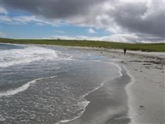 | This is the beach at sandwick below the croft. We visited it at least twice a day. We did the usual beachy things, enjoyed the rock pools, marvelled at the view, did photography and looked at the Norse homestead remains while playing cricket. Its interesting that the children think that cricket is a beach sport like volleyball (pauses while picturing what an abdominal protector would look like in a pair of speedos). The best thing seemed to be to set the children playing and then walk along it (see picture) on your own, thinking about stuff but definitely not work or overdrafts or politics or poverty or what the children are getting up to while you are doing your "I want to be alone" bit. Mostly they were making traps on the beach for you to fall down when you got back. |