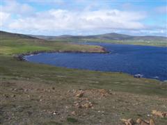Once you are off the last ferry, it is a short drive through uyeasound. Keep an eye out for the standing stone, the road to Hannigarth is just after it on the left. There is another huge stone on the road to Lund. Shetland has an ancient feel wherever you go, I suppose it is because it hasn't all been wiped out by new development. There are sights and signs of a past way of life everywhere. However, there are new features - you can just about see one of the many salmon farms in the distance near the island of Uyea. The cliffs in the far distance are on Fetlar - a good place to see a red-necked phalarope or so I'm told - I wonder what that is. |