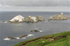 | This is the muckle flugga lighthouse and the white splodge is a whole bunch of gannets. There's a story that the little islands were rocks thrown by the giant Saxa at Herman (another giant). I'm not sure if this is true but it was lucky for the gannets anyway. The best thing about gannets is watching them dive for fish like feathered extreme sports fanatics. Terns get their food in much the same way except they hover above the sea before diving. Arctic skuas however, have the rather more disgusting technique of waiting until a tern has got a catch and then harrying it in midair until it regurgitates the fish, which the skua catches and eats before it hits the ground. On the subject of disgusting but interesting - fulmar chicks have an interesting trick with their last meal. |